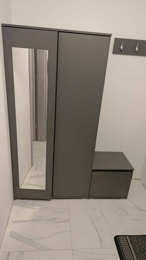 Kompaktowy zestaw mebli do przedpokoju w kolorze szarym, składający się z:+ dwu drzwiowej szafy z lustrem