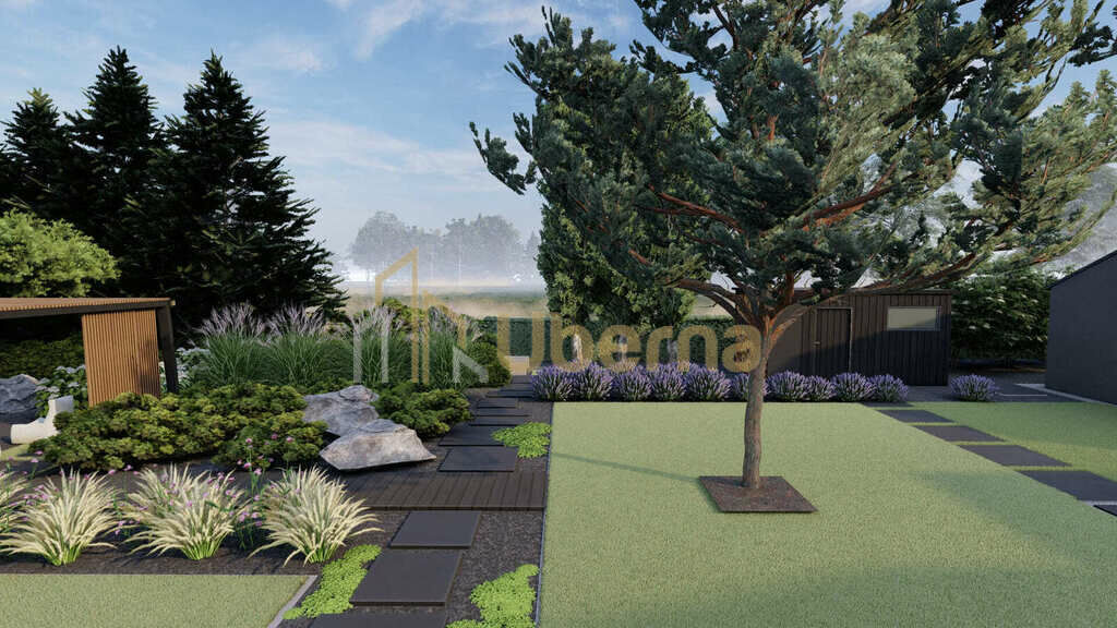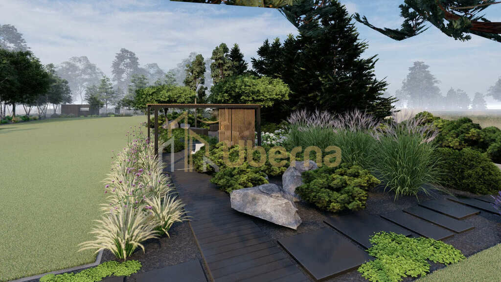 Taras (80m2): Wykonany z drewna opalanego metodą Shou Sugi Ban.